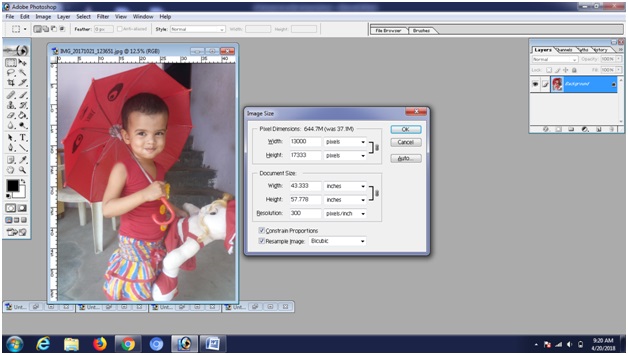 Step 4: If resolution is different from your new created file in step 1, then change this image pixel size to same as new created file. Like in the below image resolution size is 300 pixel which will give a size mismatch problem, so you should set it to 72 pixels. Other image measurements e.g. height, width, you can set according to you , but pixels/inch size must be same.