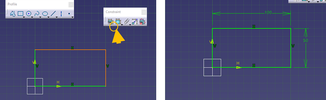 Step 6: Rectangle is created but all sides of the rectangle are not yet constrained. By constraining, degree of freedom of sketch is restricted so this step should never be left out. Selecting the sides which have not been constrained, moving to the constraint dialog box and licking on the constrain option, constrain the sketch.