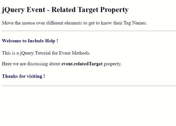 <div>Here we are discussing about <b>event.relatedTarget</b> property.</div>