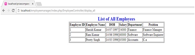 Now, run your code by using URL: http://localhost/EmployeeManager/index.php/EmployeeController/